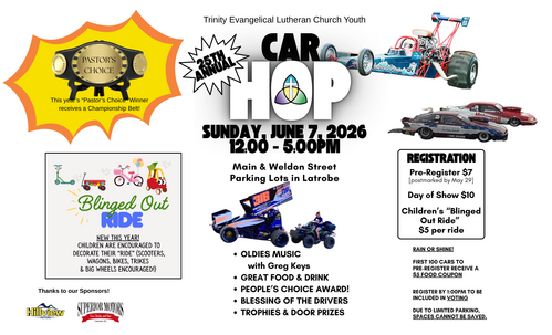 Each year on the first Sunday in June, Trinity's joy rumbles onto Weldon Street for the Annual Car Hop! This event serves as the biggest fundraiser for our youth and as an opportunity for folks of all ages to gather and enjoy an afternoon together. If you have any questions regarding the Car Hop, please contact Trinity at 724-537-4450.